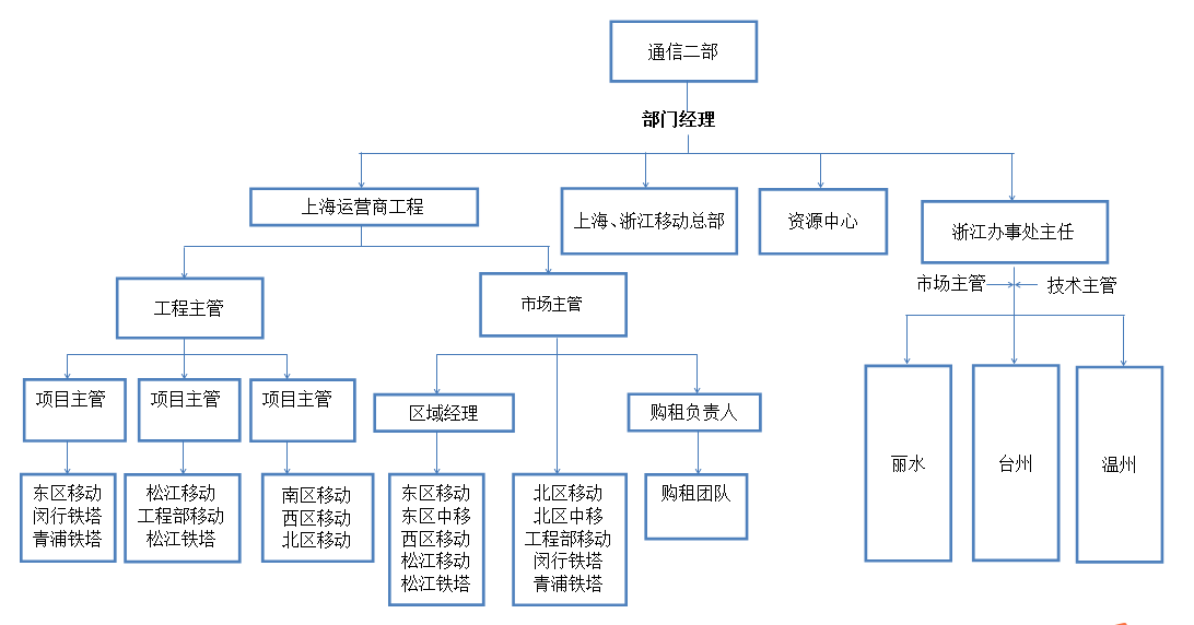 通信二部现有员工70人,主要从事上海地区中国移动、中国铁塔的基站设备安装、通信工程及系统维护、传输及管道工程、综合布线等业务,以及浙江地区GSM/CDMA等网络评估、网络优化等服务。