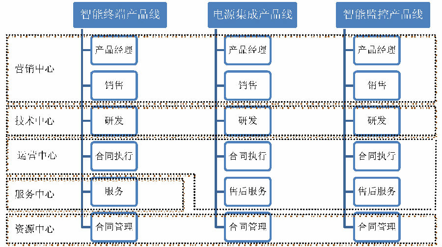 部门为矩阵型组织结构,由智能终端产品线、电源集成产品线、智能监控三大产品线组成,职能部门分为营销中心、技术中心、运营中心、服务中心、资源中心五个中心,服务于三大产品线。